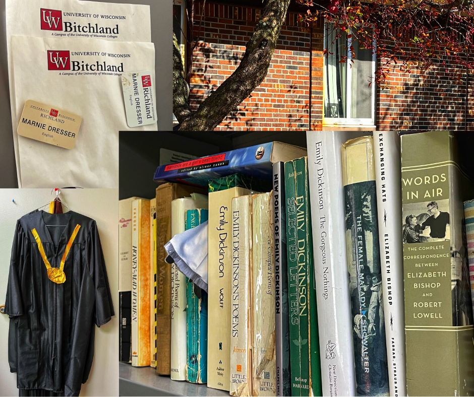Clockwise from top left: UW Bitchland letterhead (UW Bitchland will never close, btw). My office from outside, with the overhead projector transparency of Emily Dickinson which I fully intend to leave in the window. Some Dickinson and Bishop books I haven’t packed up yet (with, I think, a cardboard cutout of Dickinson sticking out from between books). And my paper-thin, cheap regalia, because I was too cheap to spend money on something I’d wear once a year (I never attended my grad school graduations so I didn’t have any). I made a medallion out of gold duct tape because I found the medallions others wore to be (somewhat/very) affected and precious, and I just wanted to be able to point to my chest and say “Mine’s bigger.” Which I did at least four times.