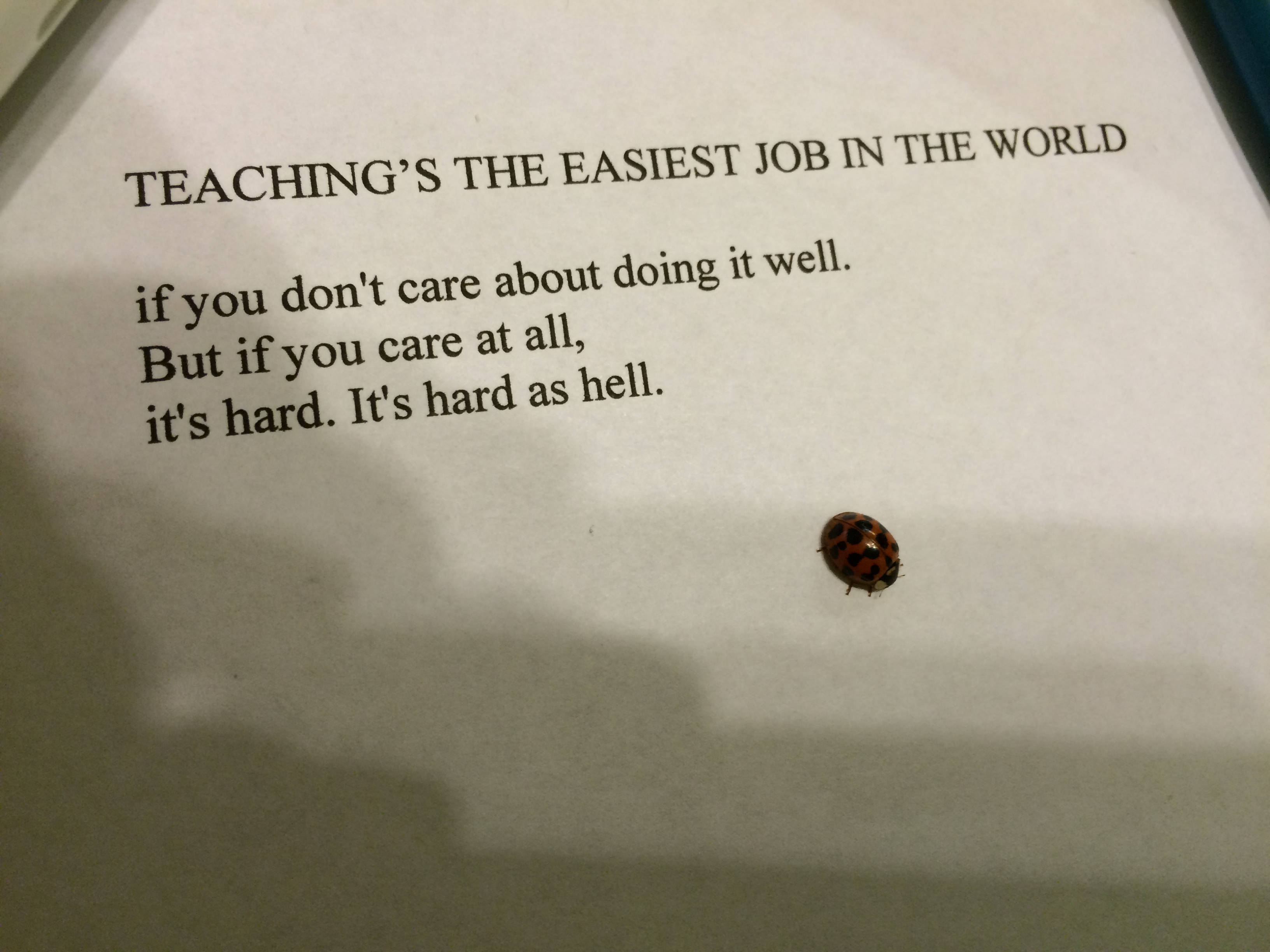 I’m not saying these are GOOD reasons, but they’re reasons I’ve discovered.  I just realized earlier this month that I’m always slower about returning student work in spring semester & one reason for that is probably because I tend to have more problems with anxiety and depression in the spring (ironic, because I love light and love when the days begin to grow longer). I discovered it because I keep track of when student work comes in and when I return it (I call it TIR for turned-in-returned rate) on a spreadsheet & I have numbers going back several years. The good news is that overall, I’m doing much better than I used to. The bad news is that my numbers have gotten ugly the last couple of spring semesters….